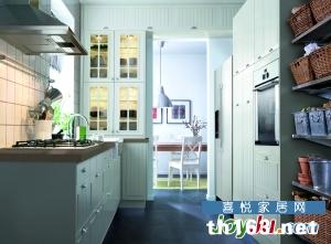 走廊式厨房是沿着两面相对墙建立两排工作和储物区。如果准备食物是厨房工作的重点,那么这种设计是一大优点。走廊式厨房不需要很大的空间,厨房尽头有门或窗即可。