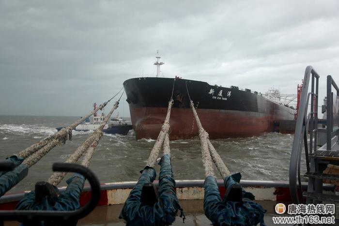 图为风大浪急未能完成离泊作业公司与船方协调采取了增加4根系缆绳、加注油轮压舱水等措施。