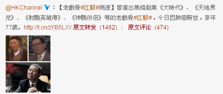 据港媒“HKChannel”官方微博报道,曾演出无线剧集《大时代》、《天地男儿》、《射雕英雄传》、《神雕侠侣》等的老戏骨江毅,今日因肺癌辞世,享年77岁。