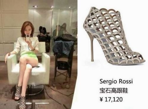 眼尖的时尚编辑认出她脚上穿的是价值1万7千人民币的Sergio Rossi施华洛奇水晶鱼鳞高跟鞋。