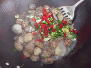 3.放入葱姜蒜干红椒段,盐,鸡精胡椒粉,翻炒到全部张口即可